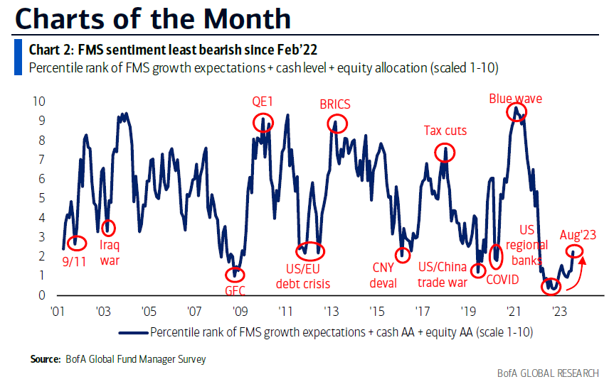 What’s interesting is that sentiment is shifting. The economy has surprised to the upside and stocks had one of their best starts to a year. As a result, several bearish analysts are changing their tunes. The Bank of America Global Fund Manager Survey surveys portfolio managers that manage hundreds of billions of dollars. Its most recent report showed that sentiment is the least bearish it has been since February 2022. Of course, one look at the chart below and it is clear there are fewer bears than before. But by no means is this what we’d call over-the-top optimism.
