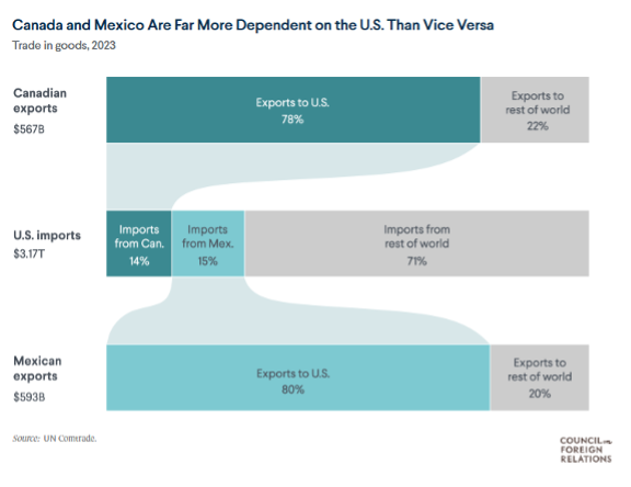 All this also tells us that Mexico and Canada rely on trade with the US much more than the other way around. Trade makes up ~ 70% of both economies’ GDP. About 80% of Mexico’s exports come to the US, while about 70% of Canadian exports come to the US. Whereas exports are not a significant piece of the US economy. This asymmetric dependency is perhaps what Trump is hoping to leverage — to get them both at the table, and extract concessions.
