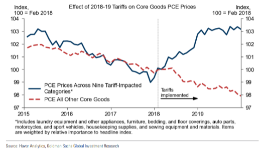 Core PCE inflation ran around 1.8% annualized in 2018-’19, below the Fed’s target of 2%. So it’s natural to think that the 2018 – ‘19 trade war didn’t have any impact on price. However, this is not the case. Prices in tariffed categories rose by almost exactly the amount of imposed tariffs, just as you would expect. However, we were already in a downtrend for core goods inflation prior to the tariffs being imposed, which continued for non-tariffed goods and offset the overall inflationary impact.